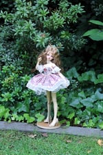 A handmade, sewn dress crafted from 100% cotton and finished with acrylic ribbon. The dress is adorned with lace and guipure, featuring a corset-style back lacing for adjustable sizing to fit similar dolls (refer to measurements below). As this dress is entirely hand-sewn, minor imperfections may be present, adding to its unique charm.