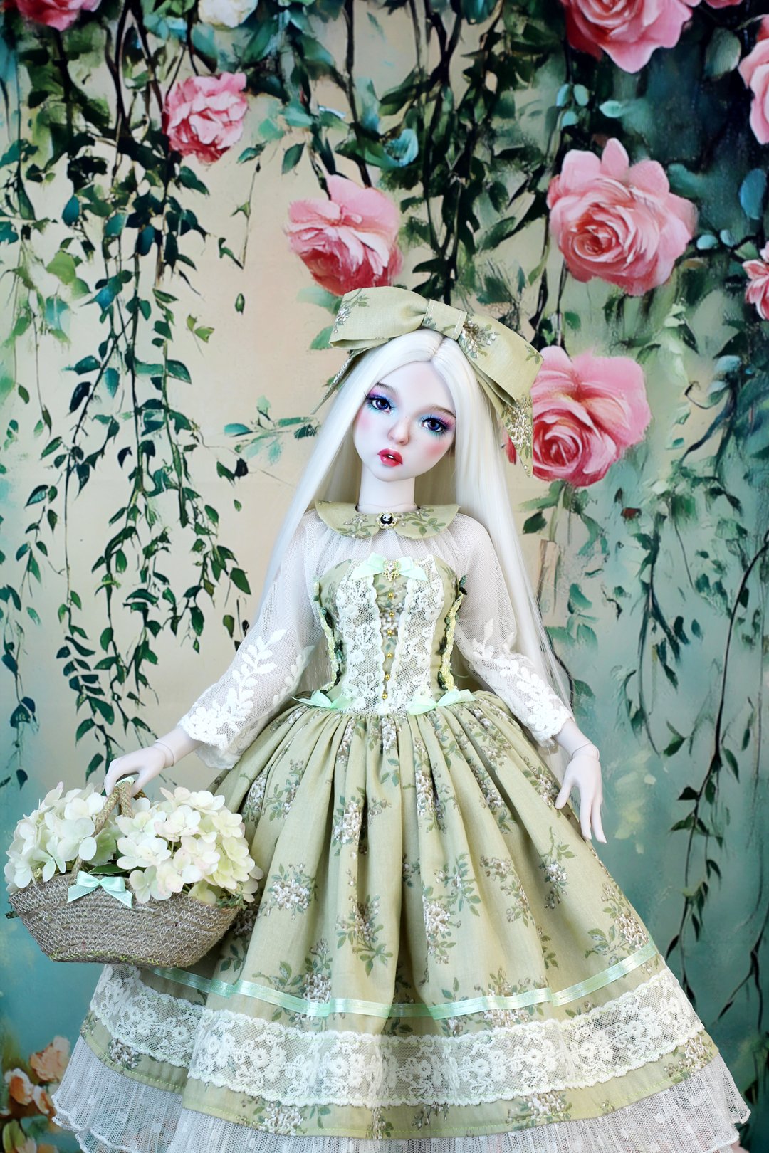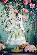 This exclusive, one-of-a-kind dress is handcrafted by me for the SD doll with a DoDollsDream Miss Marionette body, and it also fits the Little Monica SD doll. The dress is made from 100% cotton and acrylic ribbon, finished with lace and guipure. A corset binding at the back allows for easy adjustment, making it suitable for other dolls as well (please check measurements before purchasing).